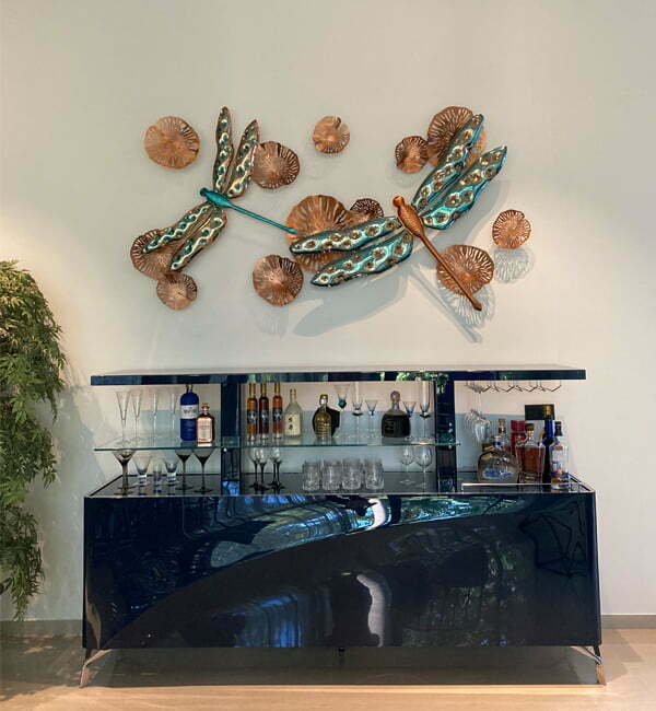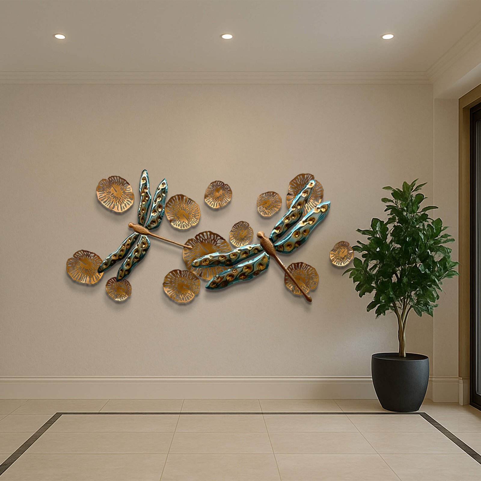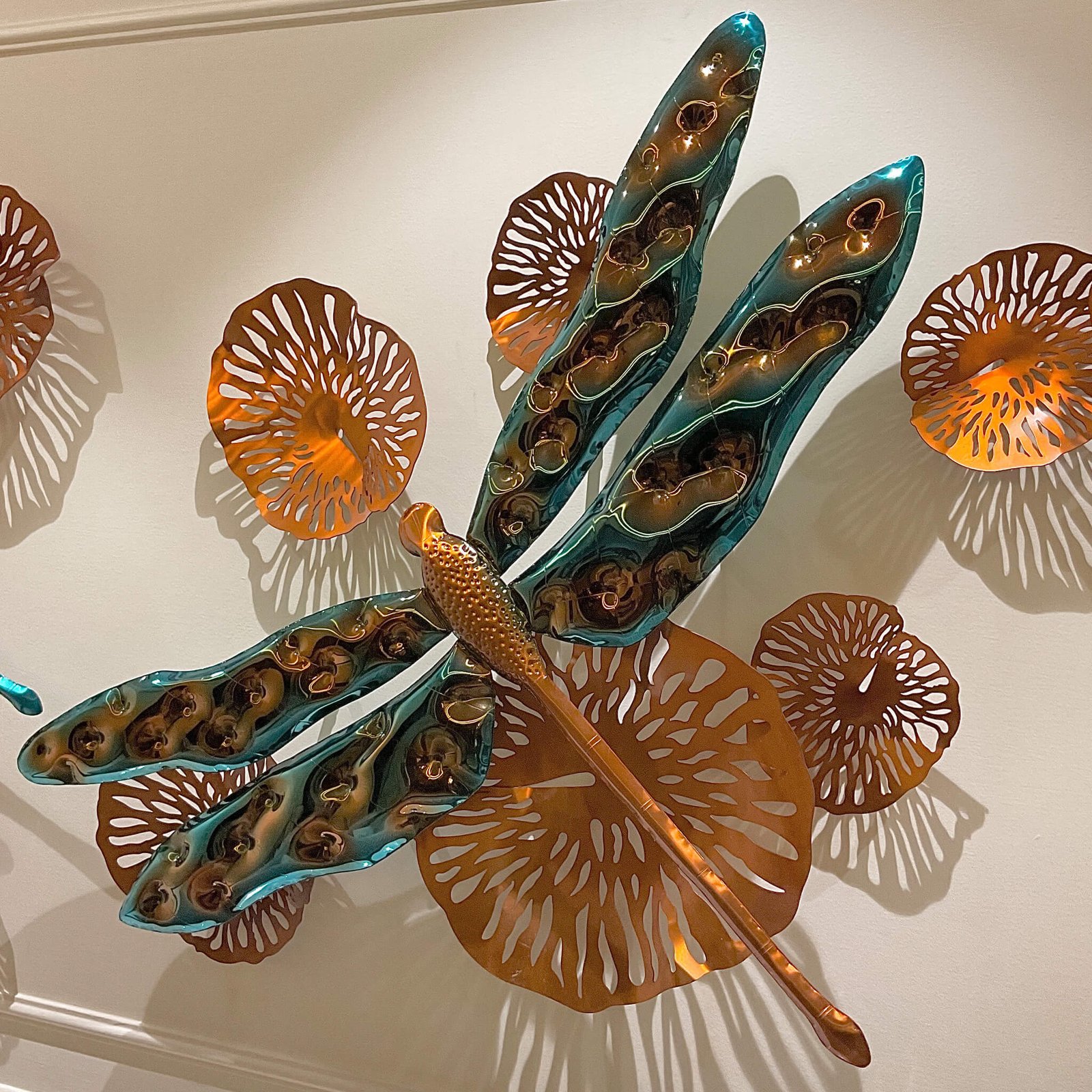 Dragonfly and Lily is a sculptural wall installation designed to bring natural rhythm and dimension to expansive spaces. Handcrafted in stainless steel, the composition features two dragonflies and twelve water lilies, each element shaped to evoke fluid motion and quiet balance.