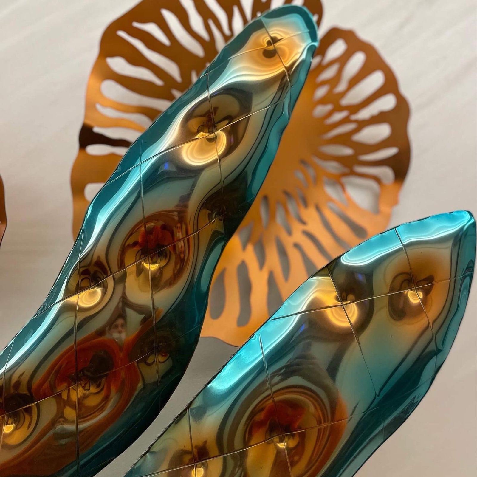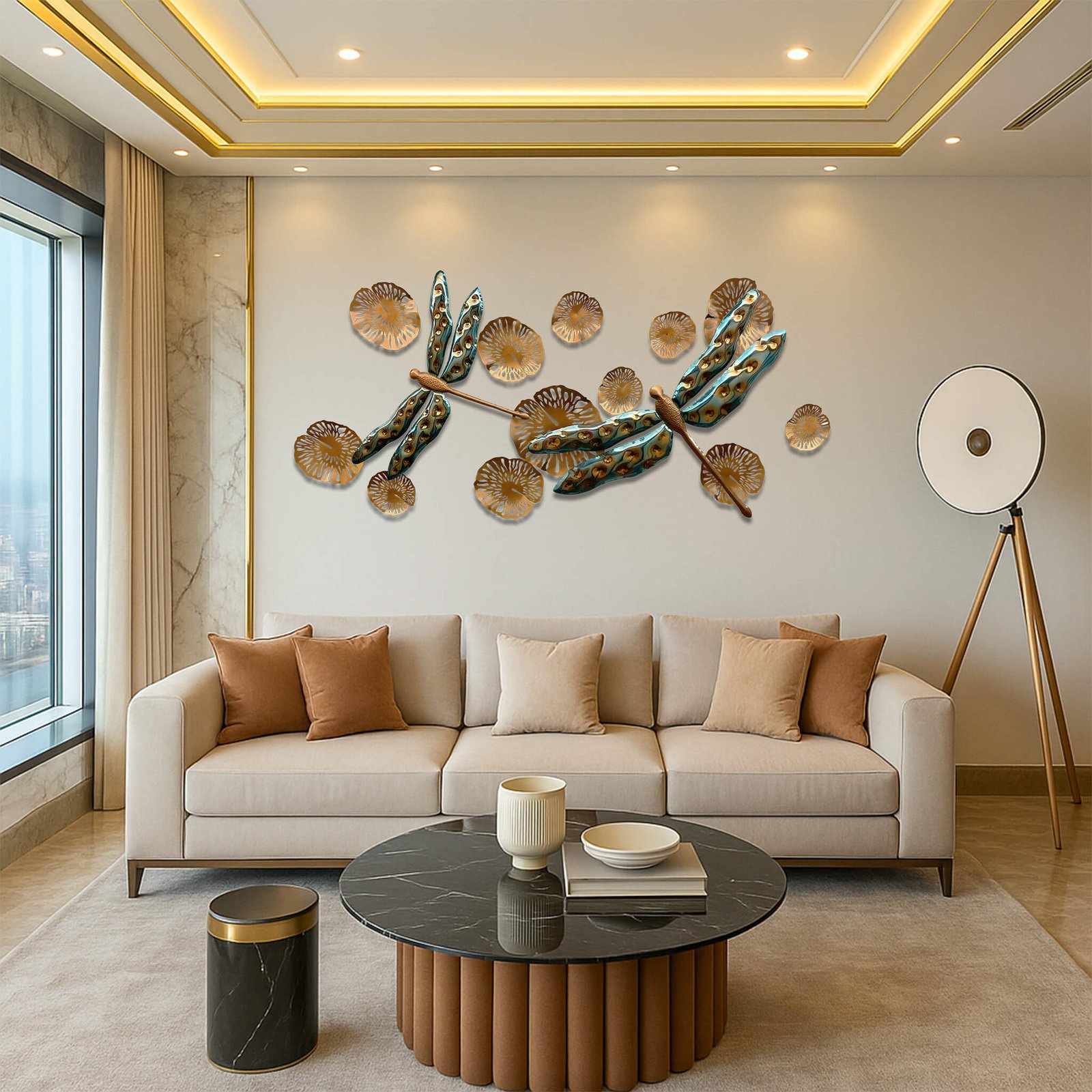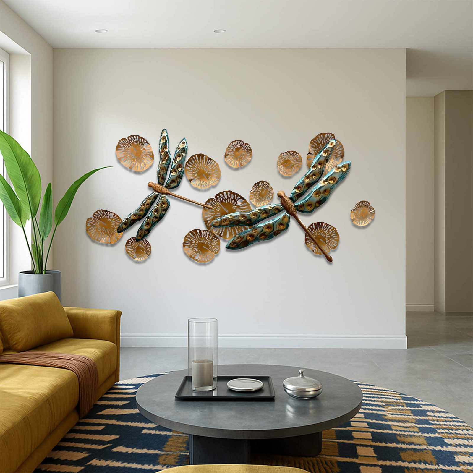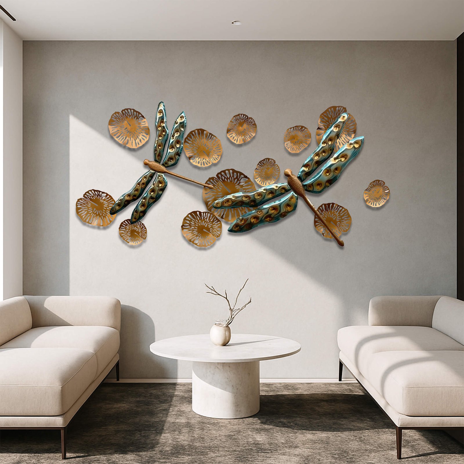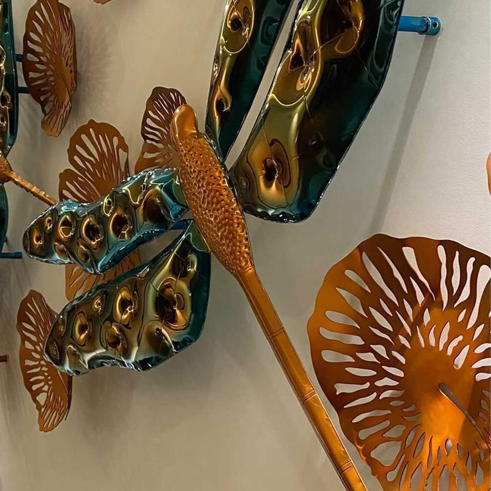Finished in rose gold and turquoise, the artwork blends air and water motifs, creating tonal contrast and material depth. The pierced lilies add lightness, while the elongated dragonflies introduce movement and spatial flow.